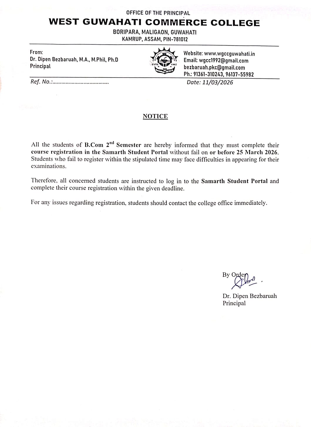 •   Notice for B.Com 2nd, 4th, & 6th Semester Arrear (Batch 2022, 2021 & 2020) Examination form Fill Up      Click Here